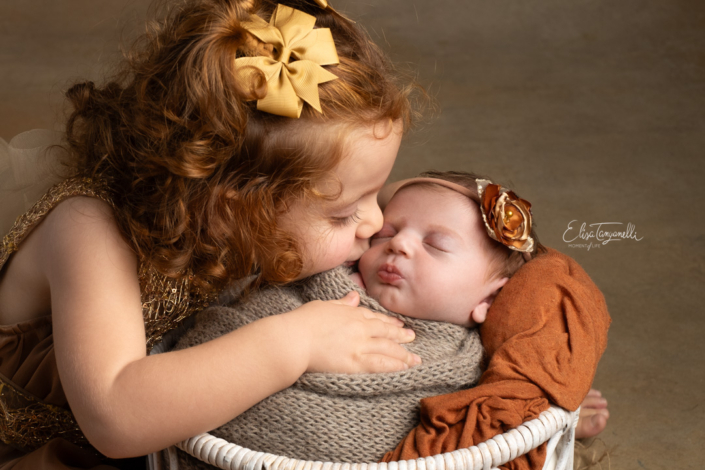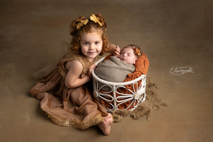 Nel caso di scatti con i fratellini, i bimbi staranno in studio il tempo necessario ad essere ritratti, in modo da non agitare il neonato.
